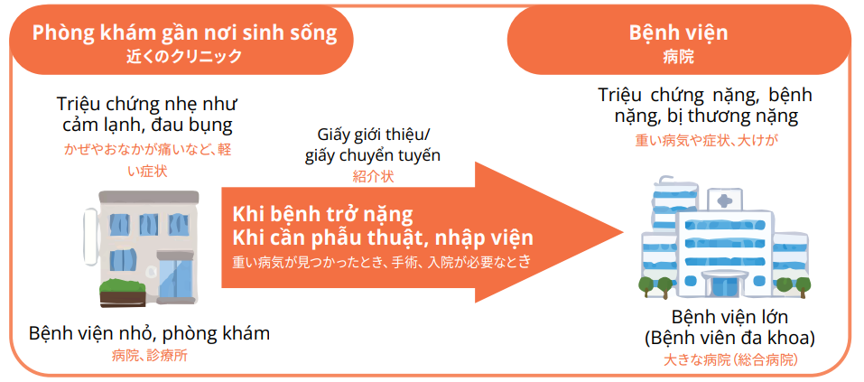 • Nếu đến bệnh viện lớn mà không có “giấy giới thiệu/giấy chuyển tuyến”, ngoài chi phí thăm khám, bạn sẽ mất thêm khoảng 1.000 yên - 8.000 yên.