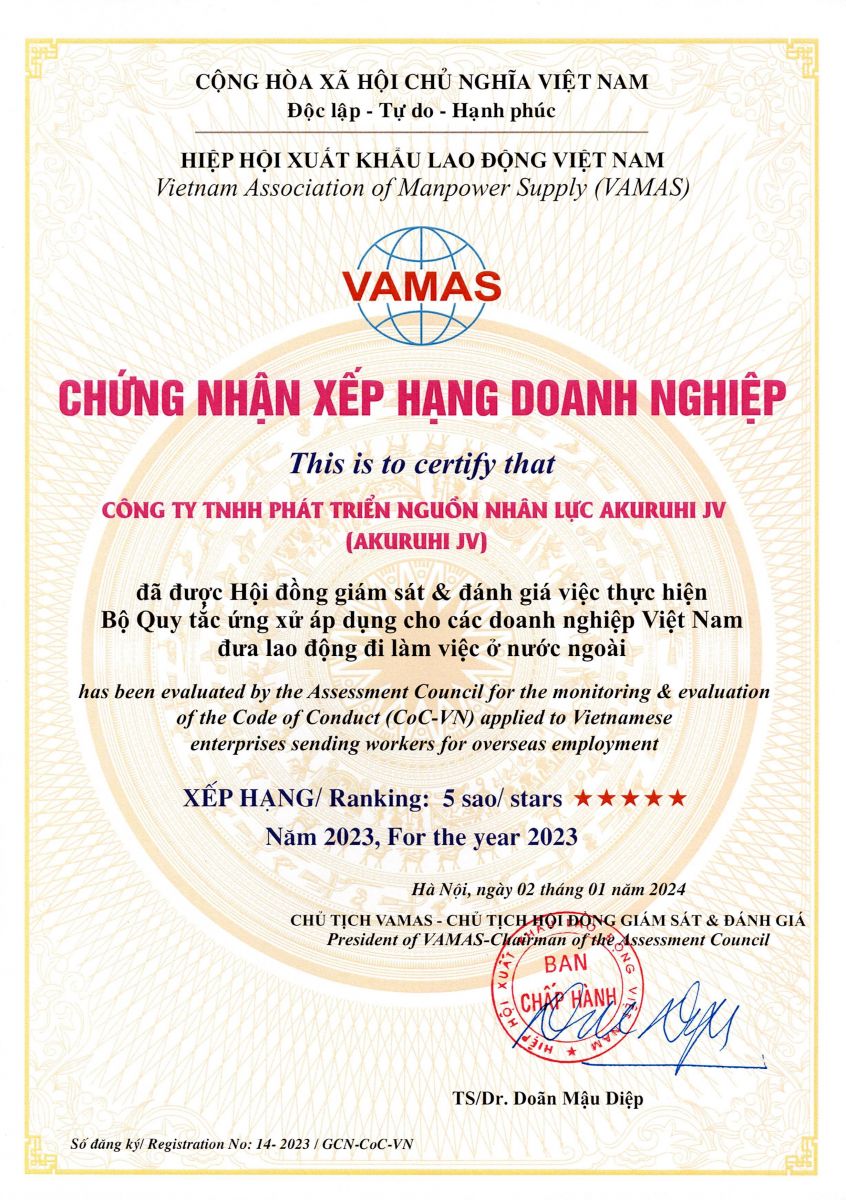 Ngày 19/01 vừa qua, Công ty TNHH Phát triển Nguồn nhân lực Akuruhi JV đã chính thức được Hiệp hội Xuất khẩu lao động Việt Nam (VAMAS) trao tặng “Chứng nhận xếp hạng doanh nghiệp 5 sao” trong việc thực hiện Bộ Quy tắc ứng xử (CoC-VN) dùng cho các doanh nghiệp Việt Nam đưa lao động đi làm việc ở nước ngoài.