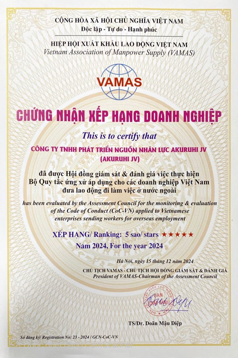 Ngày 15/12/2024 vừa qua, Công ty TNHH Phát triển Nguồn nhân lực Akuruhi JV đã chính thức được Hiệp hội Xuất khẩu lao động Việt Nam (VAMAS) trao tặng “Chứng nhận xếp hạng doanh nghiệp 5 sao” trong việc thực hiện Bộ Quy tắc ứng xử (CoC-VN) dùng cho các doanh nghiệp Việt Nam đưa lao động đi làm việc ở nước ngoài.