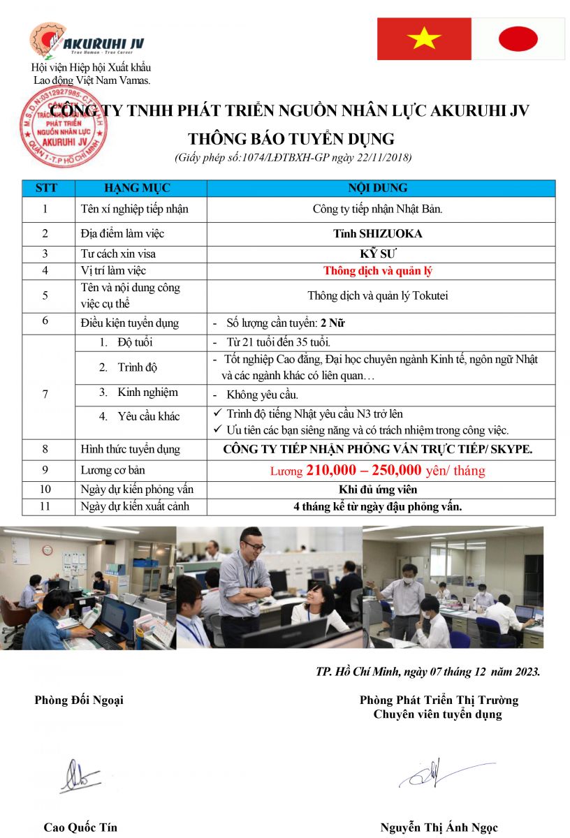 - DỰ KIẾN XUẤT CẢNH : 4 tháng kể từ ngày có kết quả phỏng vấn
