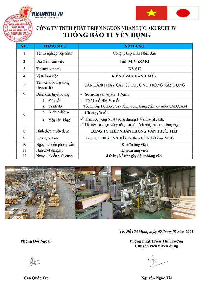 - DỰ KIẾN XUẤT CẢNH : 4 tháng kể từ ngày có kết quả phỏng vấn
