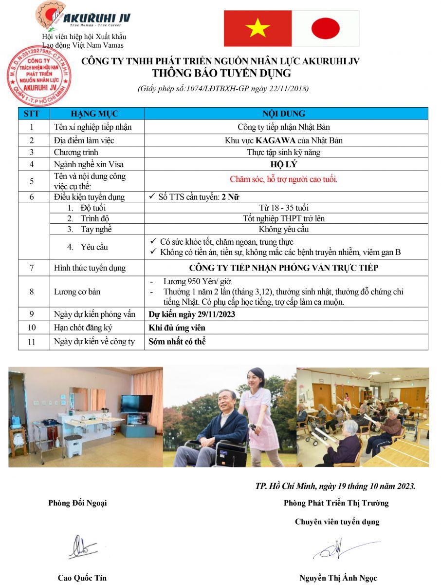 Điều dưỡng Nhật Bản là một trong những ngành đang khát nhân lực bởi hiện tại dân số đất nước này đang có tỉ lệ già hóa cao. Vì vậy, đây chính là cơ hội cho các điều dưỡng viên và người lao động tại Việt Nam sang Nhật làm việc với mức lương cũng như chế độ đãi ngộ tốt. Ngoài việc giao tiếp nâng cao khả năng ngoại ngữ của bản thân thông qua việc trao đổi trò chuyện với các cụ thì các bạn tham gia ngành hộ lý có thể thi lấy chứng chỉ quốc gia Nhật Bản (Kaigo Fukushi )(chứng chỉ điều dưỡng quốc gia) - có được chứng chỉ này các bạn có thể xin vĩnh trú tại Nhật, đưa người thân sang sinh sông. Hãy cùng Akuruhi Jv xem những thông tin tuyển dụng của đơn hàng này bạn nhé:
