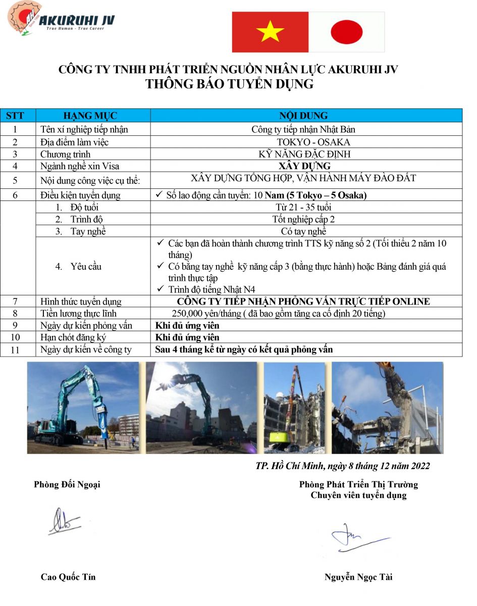 - NƠI LÀM VIỆC: Tỉnh Tokyo, Osaka