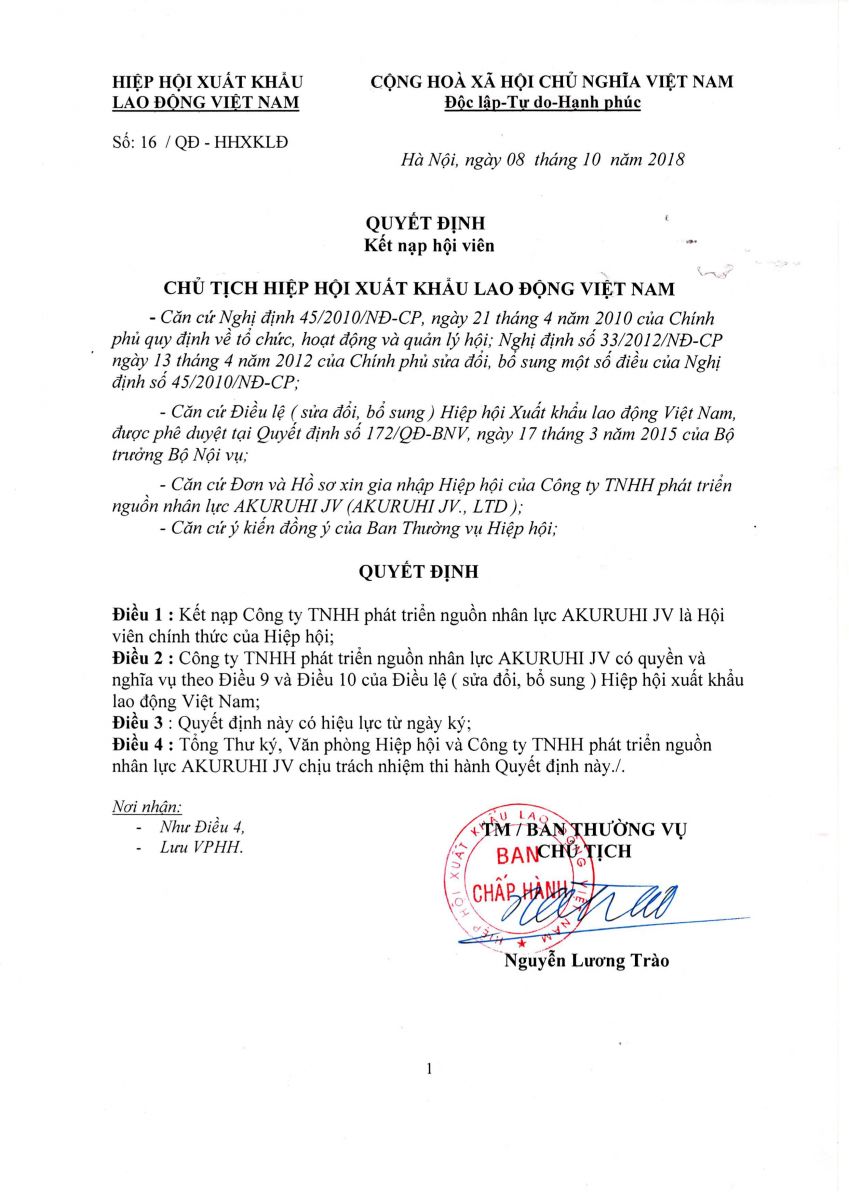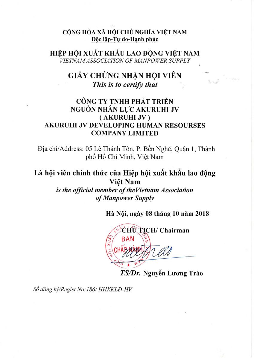 Giấy chứng nhận là hội viên của Hiệp hội xuất khẩu lao động Việt Nam