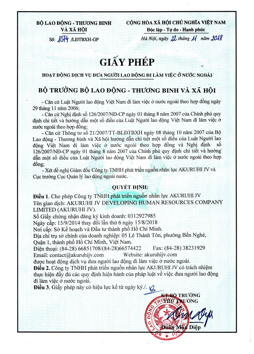 AKURUHI JV được hoạt động dịch vụ đưa người lao động đi làm việc ở nước ngoài theo Giấy phép số 1074/LĐTBXH-GP do Bộ Lao động - Thương binh và Xã hội cấp ngày 22/11/2018.