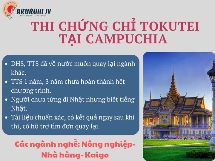 Hiện tại bên Campuchia đang tổ chức thi 3 ngành là Nhà hàng- Khách sạn, Kaigo và Nông nghiệp, ngoài ra còn tổ chức thi JFT. Nếu bạn quan tâm về chướng trình này đừng ngần ngại hãy liên hệ chúng tôi để được tư vấn miễn phí bạn nhé!